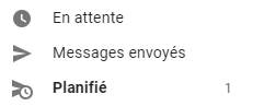 7 – Vous pouvez constater qu’un lien de menu s’ajoute à votre boîte e-mail : « Planifié ». Vous y voyez aussi le nombre de courriels vous vous avez programmé et qui ne sont pas encore partis.