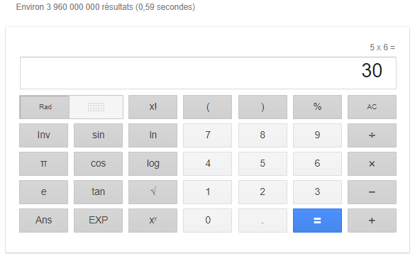 On a tous une calculatrice dans notre terminal (téléphone, tablette, ordinateur). Pendant qu’on est sur le web et qu’on a besoin de calculer, on peut éviter d’aller ouvrir le programme calculatrice. Il suffit d’ouvrir Google Search et de saisir l’expression à calculer.