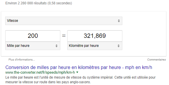Google Search te renvoie la valeur de 1 mile/h en km/h. Par la même occasion il créer une interface graphique de conversion avec d’autres unités que tu peux choisir et convertir.