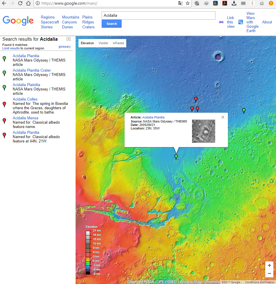 Tu peux visiter certaines d’entre elles. As-tu vu le film « The Martian » ? (en Français « Seul sur Mars »), avec Matt Deamon ? Y as-tu entendu parlé de la région « Acidalia Planitia » ? Eh bien ça existe! Je ne le savais pas moi-même avant cette découverte.