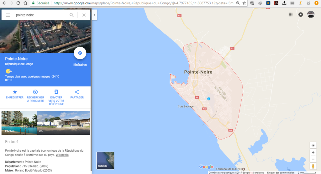Je souhaite voir la carte de la ville de Pointe noire de la République du Congo. Le résultat m’est donné :