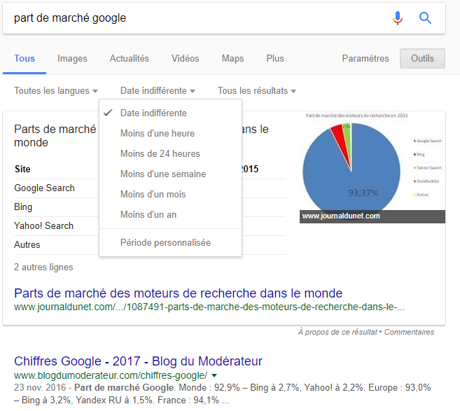 Quelques chiffres sur Google Search (selon marketshare.net) en terme de pourcentage d’utilisation par rapport aux autres moteurs de recherche :