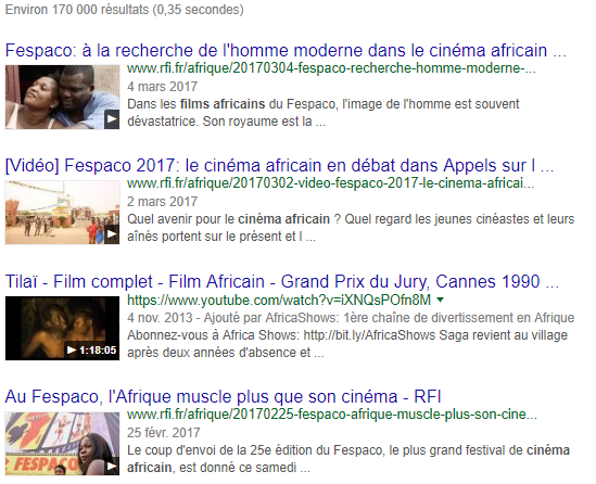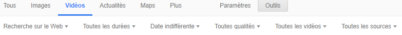 Lorsque tu recherche uniquement de la vidéo, je te recommande de cliquer sur Video avant ou après avoir saisi et validé ta recherche. Tu obtiens ainsi uniquement des liens vers des vidéos, sur différents sites (très souvent sur YouTube).